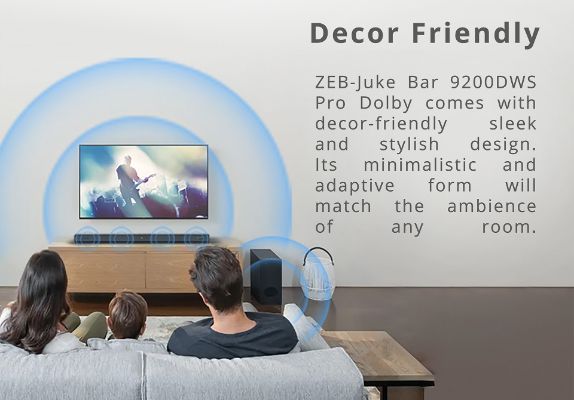 ZEB-Juke Bar 9200DWS Pro Dolby comes with digital wireless subwoofer,this subwoofer can be placed at any convenient location in the room and can wirelessly communicate with the soundbar.